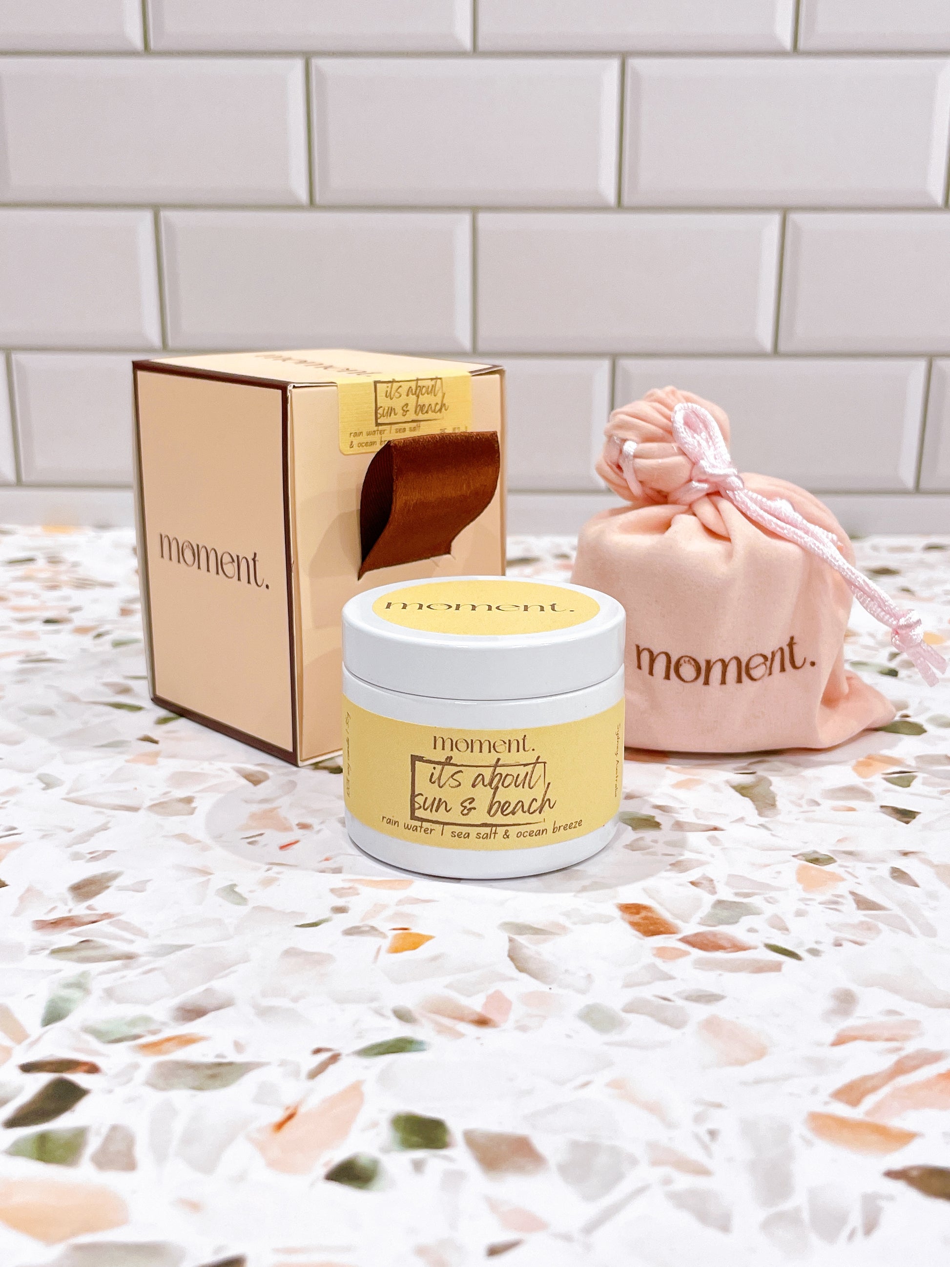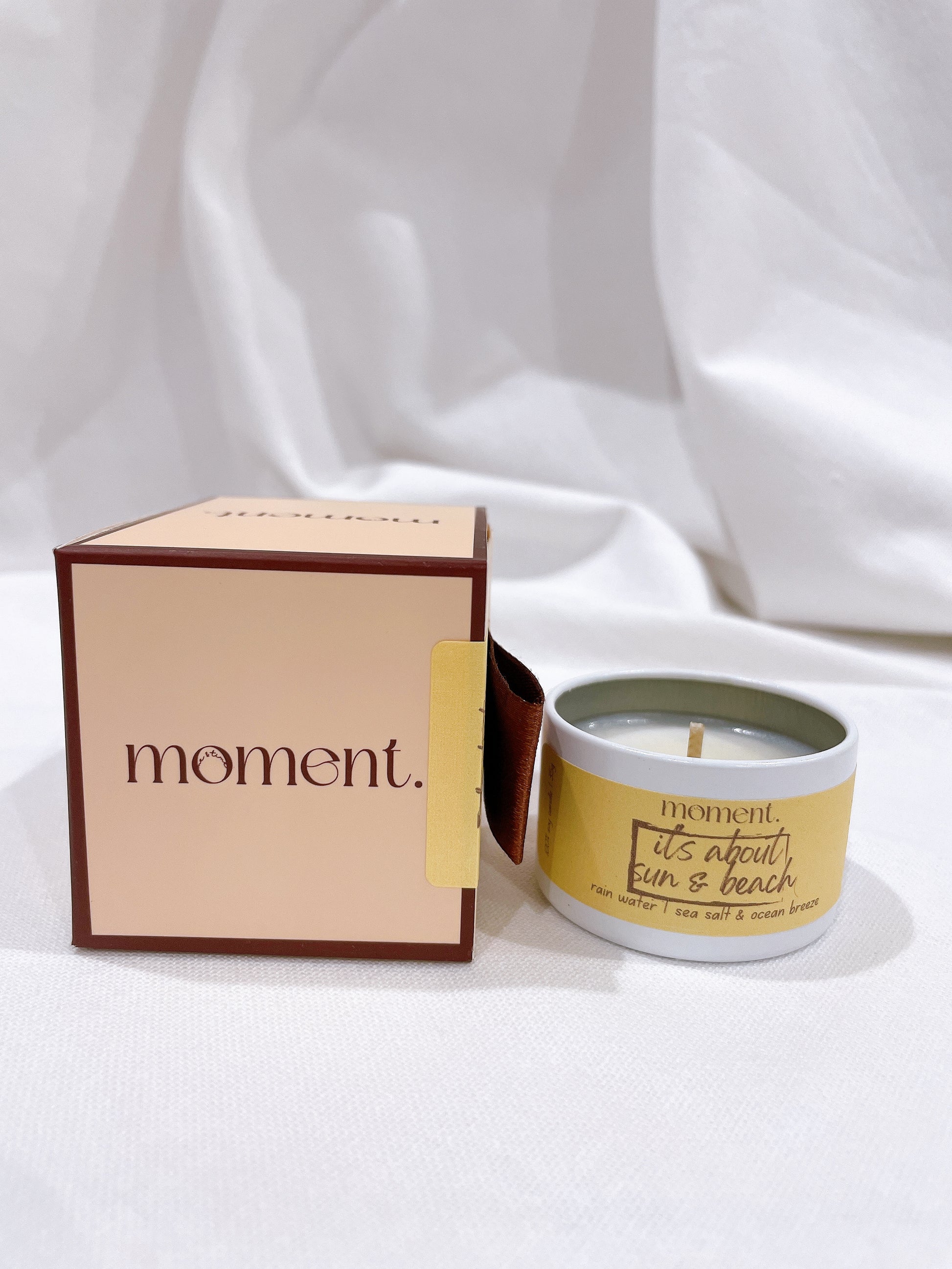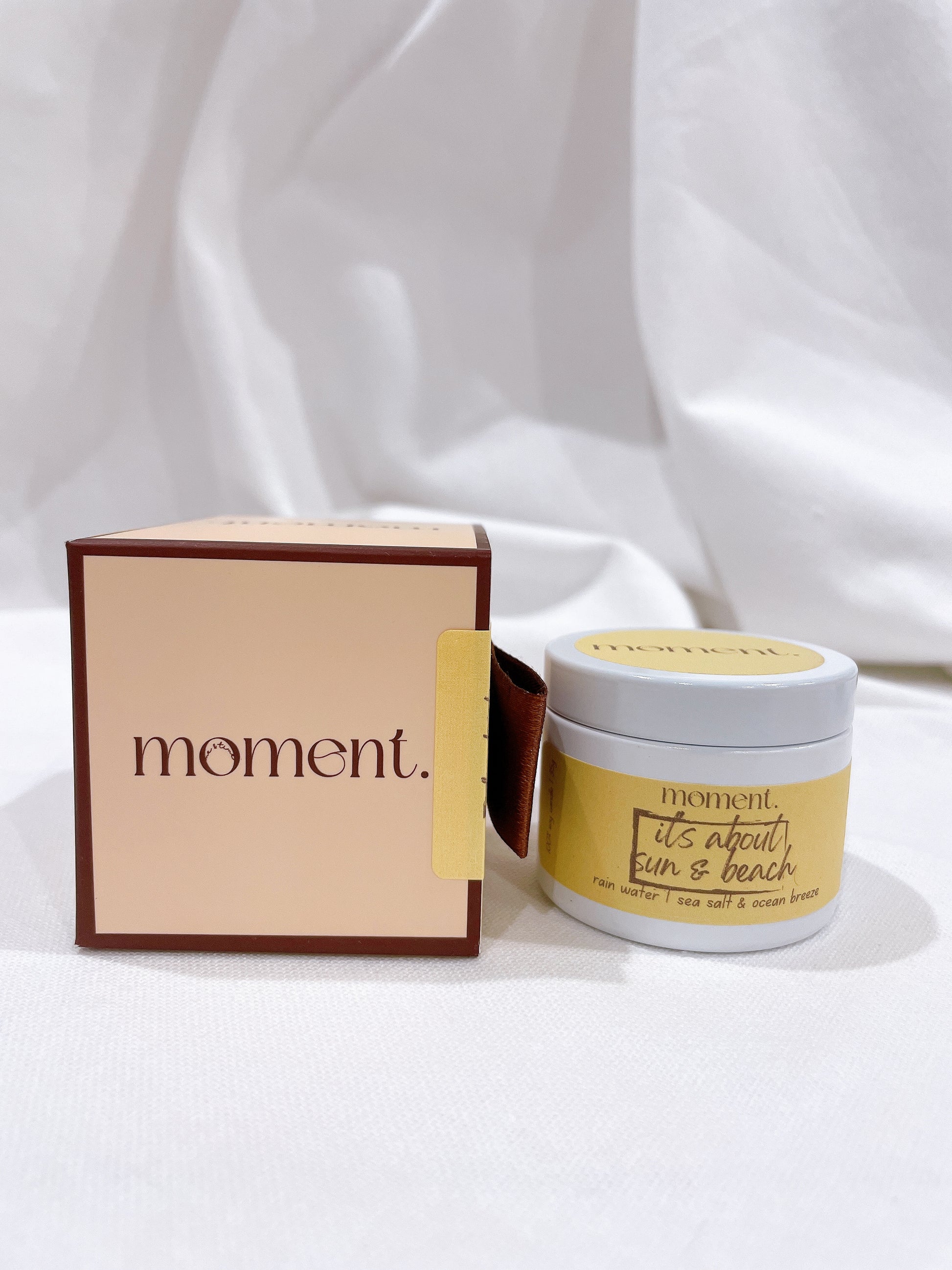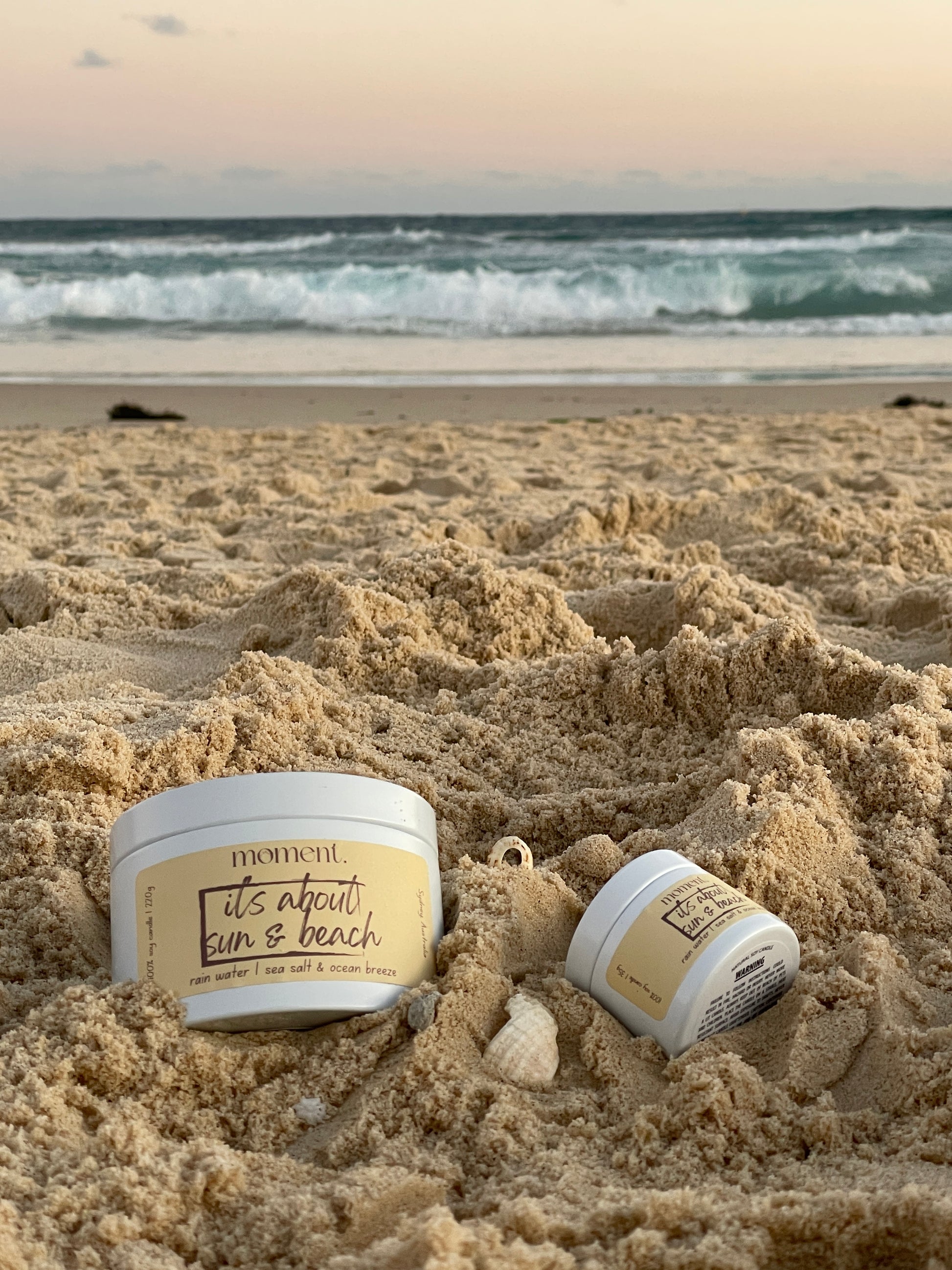 Introducing "It's About Sun and Beach" Candle - Immerse yourself in the refreshing scents of rainwater, sea salt, and ocean breeze.